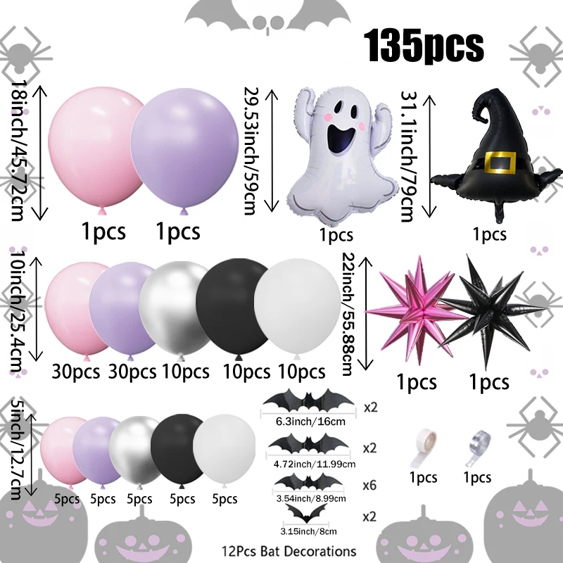 Halloween Themed Balloon Arch Set | Black, White, Pink, with Ghost, Wizard Hat-Shaped Aluminum Foil Balloons for Birthday, Halloween Theme Parties and Other Holiday Decorations | No Electricity Required, Balloons Made in Latex and Aluminum Foil